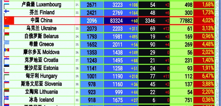 Uncategorised 10.04.2020: COVID-19 新型冠状病毒欧洲疫情表。 英国(新增死亡980)与法国(新增死亡1341)疫情仍然严峻。 意大利与西班牙新增死亡人数在六百左右。瑞士与奥地利现存患者人数继续下降。美国继续狂增。 10th April 2020 by Huaxin Admin 40 SHARES 在脸书分享 • Share on Facebook 推特 • Tweet 电子邮件关注 • Follow us Please leave this field empty .: 在这里您可以订阅我们的电子邮件通知。当我们网站上发表新文章时,您将收到一封电子邮件。:. | | .: Here you can subscripe to our email notifications. When a new article is published on our website, you will receive an email. :. .: 订阅是免费的。 所有数据将按照DSGVO进行保存。:. | :: The subscription is free of charge. All data will be saved compliant to DSGVO. :: 电子邮件 | Email Address * We don’t spam! Read our [link]privacy policy[/link] for more info. You’ve been successfully subscribed to our newsletter! 09.04.2020: COVID-19 新型冠状病毒欧洲疫情表。 英国疫情开始恶化, 今天新增死亡人数八百多 (昨天938)。 意大利, 法国与西班牙新增死亡人数也都超过五百. 瑞士与奥地利现存患者人数继续下降. 美国继续狂增。 11.04.2020: COVID-19 新型冠状病毒欧洲疫情表。 传播在英国与法国加速(两国新增确诊各七千多例, 死亡各九百多)。 意大利与西班牙情况稳定(两国新增确诊各四千左右, 死亡各五百多)。 德国现存患者人数开始下降, 瑞士与奥地利一如既往。 美国继续狂增。 Huaxin Admin 10.04.2020: COVID-19 新型冠状病毒欧洲疫情表 意大利与西班牙新增死亡人数在六百左右 瑞士与奥地利现存患者人数继续下降 美国继续狂增 英国(新增死亡980)与法国(新增死亡1341)疫情仍然严峻 Related articles 23.05.2023: COVID-19 新型冠状欧洲疫情表05.05.2023: COVID-19 新型冠状欧洲疫情表22.04.2023: COVID-19 新型冠状欧洲疫情表11.04.2023: COVID-19 新型冠状欧洲疫情表02.04.2023: COVID-19 新型冠状欧洲疫情表01.04.2023: COVID-19 新型冠状欧洲疫情表30.03.2023: COVID-19 新型冠状欧洲疫情表29.03.2023: COVID-19 新型冠状欧洲疫情表28.03.2023: COVID-19 新型冠状欧洲疫情表26.03.2023: COVID-19 新型冠状欧洲疫情表25.03.2023: COVID-19 新型冠状欧洲疫情表24.03.2023: COVID-19 新型冠状欧洲疫情表