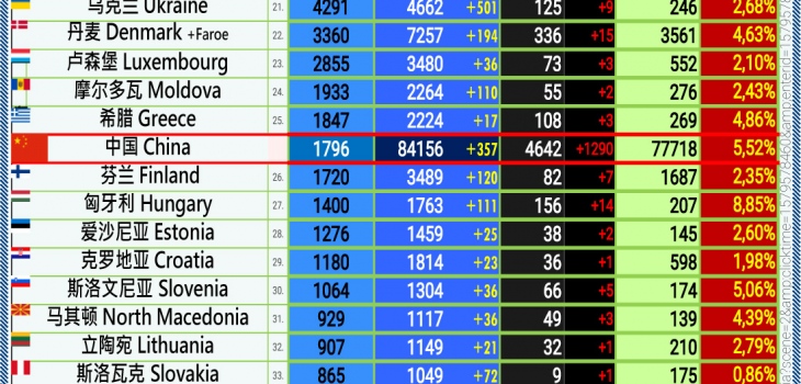 Uncategorised 17.04.2020: COVID-19 新型冠状病毒欧洲疫情表。 暴增: 法国24小时内新增确诊人数为一万七千多(新增死亡753例), 已成为欧洲第一重灾区。 西班牙与英国继续大面积的传播(两国新增确诊都超过五千例)。 中国数据跟新:中国病亡人数增加1290例,现在包括在医院外死亡的患者。官方总数现为4642病亡者。美国继续狂增。 17th April 2020 by Huaxin Admin 40 SHARES 在脸书分享 • Share on Facebook 推特 • Tweet 电子邮件关注 • Follow us Please leave this field empty .: 在这里您可以订阅我们的电子邮件通知。当我们网站上发表新文章时,您将收到一封电子邮件。:. | | .: Here you can subscripe to our email notifications. When a new article is published on our website, you will receive an email. :. .: 订阅是免费的。 所有数据将按照DSGVO进行保存。:. | :: The subscription is free of charge. All data will be saved compliant to DSGVO. :: 电子邮件 | Email Address * We don’t spam! Read our [link]privacy policy[/link] for more info. You’ve been successfully subscribed to our newsletter! 16.04.2020: COVID-19 新型冠状病毒欧洲疫情表。 严峻: 24小时内新增死亡人数: 法国1438,英国861,德国334(记录新高),比利时417。 病毒继续扩散: 法国,英国(突破10万确诊),西班牙,土耳其,德国,荷兰,比利时,爱尔兰,葡萄牙与俄罗斯。 美国一天内病亡六千多人,世界新高纪录。 18.04.2020: COVID-19 新型冠状病毒欧洲疫情表。 病毒在俄罗斯与土耳其加速传播, 英国与法国情况仍然紧张(两国新增死亡超过七百多)。 奥地利(今天)与德国(昨天)突破3%的病亡率, 但现存患者人数继续下降。 西班牙与意大利情况比较稳定。 美国继续狂增。 Huaxin Admin 17.04.2020: COVID-19 新型冠状病毒欧洲疫情表 中国数据跟新:中国病亡人数增加1290例 官方总数现为4642病亡者 已成为欧洲第一重灾区 暴增:法国24小时内新增确诊人数为一万七千多(新增死亡753例) 现在包括在医院外死亡的患者 美国继续狂增 西班牙与英国继续大面积的传播(两国新增确诊都超过五千例) Related articles 23.05.2023: COVID-19 新型冠状欧洲疫情表05.05.2023: COVID-19 新型冠状欧洲疫情表22.04.2023: COVID-19 新型冠状欧洲疫情表11.04.2023: COVID-19 新型冠状欧洲疫情表02.04.2023: COVID-19 新型冠状欧洲疫情表01.04.2023: COVID-19 新型冠状欧洲疫情表30.03.2023: COVID-19 新型冠状欧洲疫情表29.03.2023: COVID-19 新型冠状欧洲疫情表28.03.2023: COVID-19 新型冠状欧洲疫情表26.03.2023: COVID-19 新型冠状欧洲疫情表25.03.2023: COVID-19 新型冠状欧洲疫情表24.03.2023: COVID-19 新型冠状欧洲疫情表