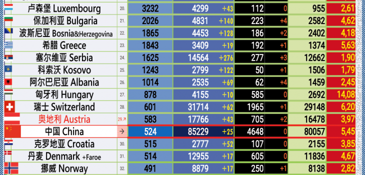 30.06.2020: COVID-19 新型冠状欧洲疫情表。
