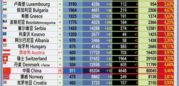 欧洲: 奥地利现存患者人数还在上升 (现排行欧洲第28)。 英国的疫情已经减速, 瑞典已成欧洲第二大传播热点, 俄罗斯传播不停。 此外疫情在白俄罗斯,乌克兰,葡萄牙,亚美尼亚,马其顿,摩尔多瓦与土耳其继续蔓延。 意大利现存患者人数继续下降。