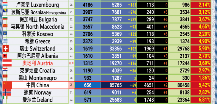 16.07.2020: COVID-19 新型冠状欧洲疫情表。