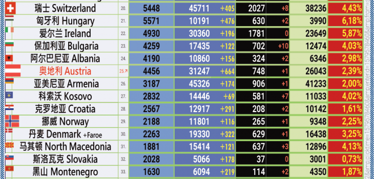 今日新增确诊人数突破六百多例 (一半以上在维也纳), 这是自03月31日以来的最新高。新感染的数量再次大量的增加,特别是在维也纳。内政和卫生部周四报道,在过去的24小时内,整个奥地利登记的新型冠状病毒感染数量为664,新感染数字已经连续第三天超过五百。本周四现存患者人数已上升到四千四百病例以上。目前在医院接受治疗的感染者增加至205(+8)名,重症监护患者的人数增加 至39(+3)。