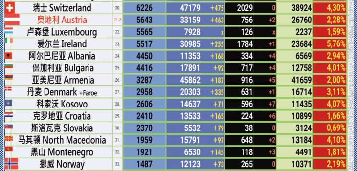 今日新增确诊人数低于五百例 , 这也是本周首次。 乍一看这似乎是一个很大的下降,但是首先近500新感染的水平仍然很高,其次周日的数字总是低于平常。因此奥地利的疫情还未达到起色的趋势。内政和卫生部周日报道,在过去的24小时内,整个奥地利登记的新型冠状病毒感染数量为463。本周日现存患者人数已上升到五千六百病例以上。目前在医院接受治疗的感染者增加至226(+17)名,重症监护患者的人数增加至44(+2)。
