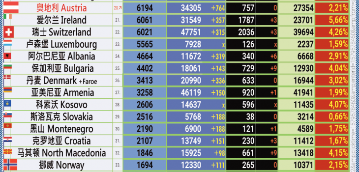 24小时内具体有764 例新感染 ( 维也纳:400, 蒂罗尔州:110, 下奥地利州:95, 上奥地利州:57, 施蒂里亚州:44, 福拉尔贝格州:25, 萨尔茨堡州:20, 布尔根兰州:6, 克恩顿州:7).