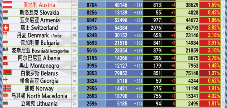 24小时内具体有 714 例新感染 (维也纳:249, 下奥地利州:134, 上奥地利州:127, 蒂罗尔州:69, 施蒂里亚州:38, 萨尔茨堡州:34, 福拉尔贝格州:32, 克恩顿州:19, 布尔根兰州:12).