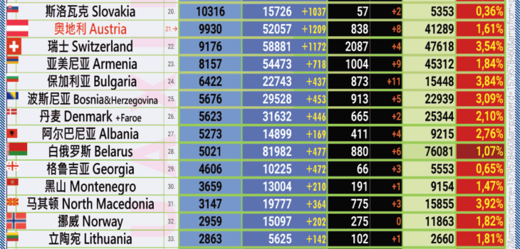 卫生与食品安全局(AGES)在周四的通讯报道中指出,每周观看而不是每天观看的重要性: 按照流行病学想看清状况,需要“ 7天的病例数,7天的发病率,一个日历周内的新的感染群数据,来源明确的病例”。 AGES 写道:“在这方面,只看每日更新的数据是不能达到目标的。” 所有读者也可以阅读我们每周更新的 《华新日报欧洲版》 • 全球疫情表+各国7日发病率 与 • 疫情报告日历周