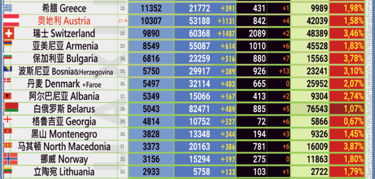 24小时内具体有 1131 例新感染 (维也纳:392, 下奥地利州:223, 上奥地利州:163, 蒂罗尔州:116, 施蒂里亚州:90, 萨尔茨堡州:58, 福拉尔贝格州:39, 克恩顿州:27, 布尔根兰州:23).