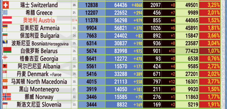 24小时内具体有 979 例新感染 (维也纳:327, 下奥地利州:170, 上奥地利州:130, 蒂罗尔州:124,福拉尔贝格州:72, 施蒂里亚州:49, 萨尔茨堡州:48, 克恩顿州:30, 布尔根兰州:29).