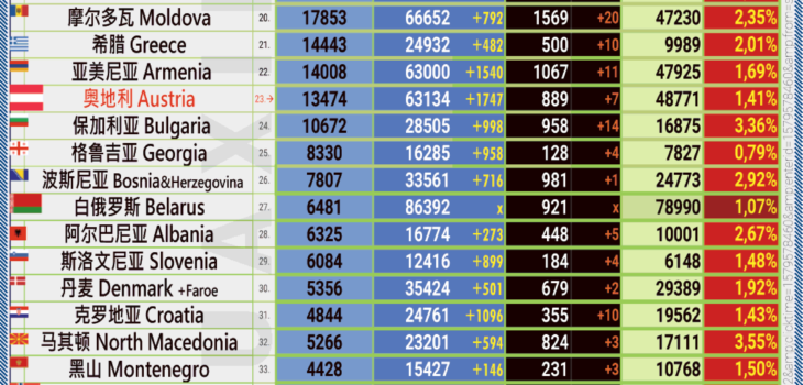 24小时内具体有 1747 例新感染 (维也纳:599, 下奥地利州:266, 上奥地利州:226, 蒂罗尔州:225, 萨尔茨堡州:159, 施蒂里亚州:122, 福拉尔贝格州:78, 克恩顿州:47, 布尔根兰州:25).
