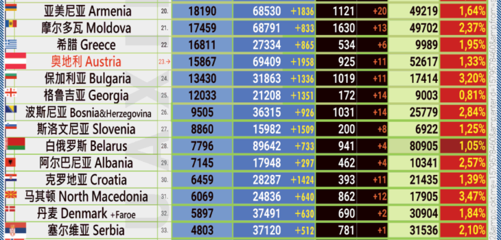 24小时内具体有 1958例新感染 (维也纳:514, 下奥地利州:341, 上奥地利州:328, 蒂罗尔州:232, 萨尔茨堡州:197, 施蒂里亚州:174, 福拉尔贝格州:83, 克恩顿州:55, 布尔根兰州:34).