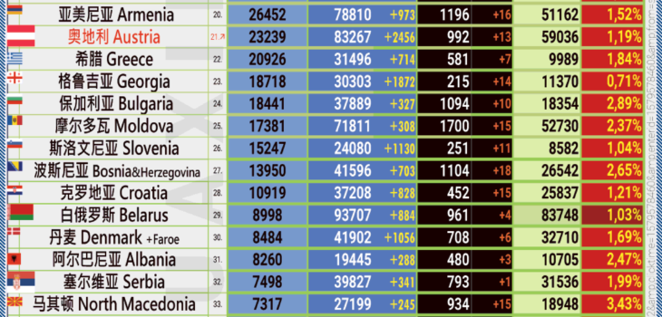 24小时内具体有 2456 例新感染 (上奥地利州:612, 维也纳:494, 施蒂里亚州:334, 蒂罗尔州:282, 下奥地利州:232,萨尔茨堡州:221, 福拉尔贝格州:136, 布尔根兰州:102, 克恩顿州:43).