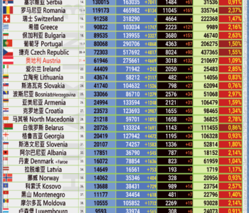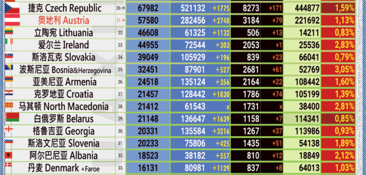 24小时内具体有 4047 例新感染 (下奥地利州:762, 施蒂里亚州:692, 上奥地利州:647, 维也纳州:621, 克恩顿州:446, 萨尔茨堡州:346, 蒂罗尔州:293, 布尔根兰州:124, 福拉尔贝格州:116).