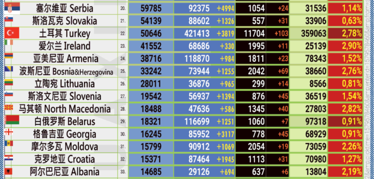 24小时内具体有 5984 例新感染 (上奥地利州:1230, 萨尔茨堡州:826, 下奥地利州:751, 克恩顿州:737, 蒂罗尔州:722, 维也纳:700, 施蒂里亚州:545, 福拉尔贝格州:295, 布尔根兰州:178).