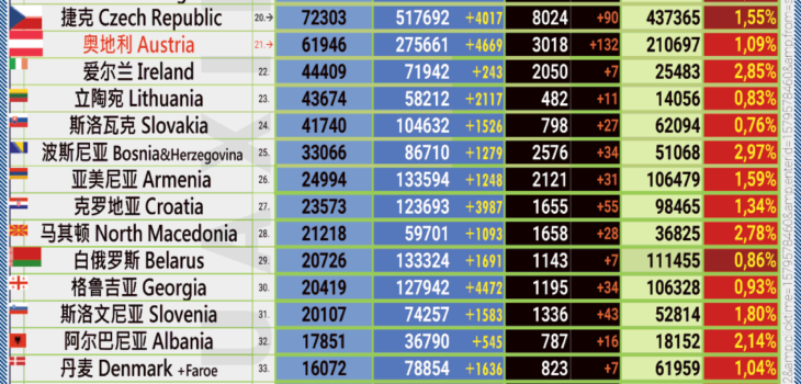 Uncategorised 28.11.2020: COVID-19 新型冠状欧洲疫情表。 28th November 202028th November 2020 by Huaxin Admin 40 SHARES 在脸书分享 • Share on Facebook 推特 • Tweet 电子邮件关注 • Follow us Please leave this field empty .: 在这里您可以订阅我们的电子邮件通知。当我们网站上发表新文章时,您将收到一封电子邮件。:. | | .: Here you can subscripe to our email notifications. When a new article is published on our website, you will receive an email. :. .: 订阅是免费的。 所有数据将按照DSGVO进行保存。:. | :: The subscription is free of charge. All data will be saved compliant to DSGVO. :: 电子邮件 | Email Address * We don’t spam! Read our [link]privacy policy[/link] for more info. You’ve been successfully subscribed to our newsletter! 28.11.2020: COVID-19 奥地利疫情报告。 29.11.2020: COVID-19 奥地利疫情报告。 Huaxin Admin 28.11.2020: COVID-19 新型冠状欧洲疫情表 Related articles 23.05.2023: COVID-19 新型冠状欧洲疫情表05.05.2023: COVID-19 新型冠状欧洲疫情表22.04.2023: COVID-19 新型冠状欧洲疫情表11.04.2023: COVID-19 新型冠状欧洲疫情表02.04.2023: COVID-19 新型冠状欧洲疫情表01.04.2023: COVID-19 新型冠状欧洲疫情表30.03.2023: COVID-19 新型冠状欧洲疫情表29.03.2023: COVID-19 新型冠状欧洲疫情表28.03.2023: COVID-19 新型冠状欧洲疫情表26.03.2023: COVID-19 新型冠状欧洲疫情表25.03.2023: COVID-19 新型冠状欧洲疫情表24.03.2023: COVID-19 新型冠状欧洲疫情表