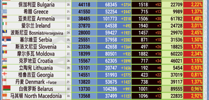 24小时内具体有 4182 例新感染 (上奥地利州:1098, 维也纳:830, 下奥地利州:今日无数据*, 施蒂里亚州:592,蒂罗尔州:560, 福拉尔贝格州:500, 萨尔茨堡州:236,克恩顿州:234, 布尔根兰州:132).