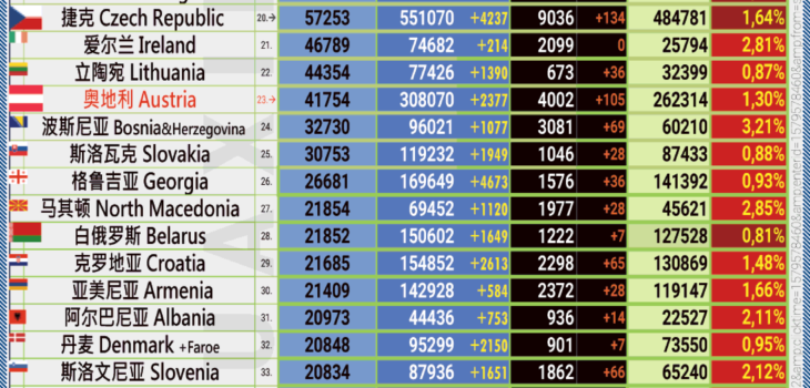 24小时内具体有 2377 例新感染 (上奥地利州:456, 维也纳州:362, 施蒂里亚州:361, 下奥地利州:304, 蒂罗尔州:263, 克恩顿州:259, 萨尔茨堡州:241, 福拉尔贝格州:75, 布尔根兰州:56).