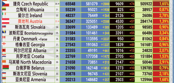 Uncategorised 14.12.2020: COVID-19 奥地利疫情报告。 14th December 202014th December 2020 by Huaxin Admin 奥地利疫情指标开始上涨 今日新增确诊人数近两千六百病例。内政 和 卫生部周一报道,在过去的24小时内,整个奥地利登记的新型冠状病毒感染数量为 2588。本周一的现存患者人数略有减少至三万六千三百病例以上。 目前在医院接受治疗的感染者增加至 3479 (+35)名,重症监护患者的人数增加至 594 (+17)。 24小时内具体有 2588 例新感染 (上奥地利州:543, 下奥地利州:448, 施蒂里亚州:448, 维也纳州:358, 克恩顿州:239, 萨尔茨堡州:220, 福拉尔贝格州:110, 蒂罗尔州:143, 布尔根兰州:79). 周一新增: 近两千六百例新感染 最多的新感染发生在上奥地利州。其次是施蒂里亚州与下奥地利州。在过去的24小时内,在奥地利进行了 17 562次PCR测试, 其中 2 588 个人的测试结果为阳行。这意味着阳性率约为14.7%。星期一的新感染数低于7天平均数 (为每天 2765 例新感染)。 但是,过去24小时内报告的测试明显少于过去7天平均的 23 283 次测试结果。 新趋势还是异常? 自大流行开始以来,已经报告了325 051例阳性检测结果。共有 284 174人康复,周一还有36 347 名现存患者。与周日相比少了 537。 但是,下降幅度明显低于过去7天的平均水平,过去7天每天的现存患者人数平均比前一天减少 1234人。无论是新趋势还是与周末相关的异常现象,仍有待观察。 住院病人的数量也在增长 住院新冠患者也在增长,增加了 35名。 目前,有 3 479例COVID/19患者住院,其中594 例在重症监护室。 在这里与星期日相比也有增加,多了 17 名。