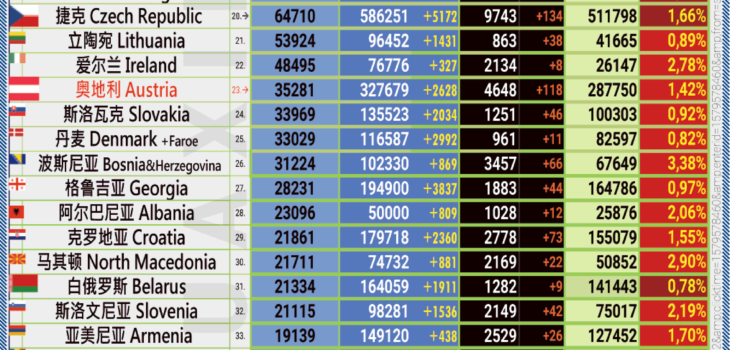 24小时内具体有 2628 例新感染 (下奥地利州:491, 上奥地利州:467, 萨尔茨堡州:397, 维也纳州:326, 施蒂里亚州:307, 克恩顿州:301, 蒂罗尔州:217, 福拉尔贝格州:82,布尔根兰州:40).