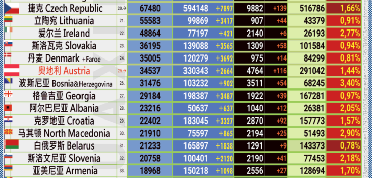 最多的新感染发生在上奥地利州。其次是下奥地利州与施蒂里亚州。就在一周多前硬封锁结束的时候,奥地利登记了 2263 例新感染。 此后从未达到过类似的数值。在过去的几天中,这一数字一直稳定的增长。 而且今天,又达到太高数。 据卫生部和内政部的数据,从星期二至星期三有 2664 例新感染。在过去的七天里,平均每天有 2763 例新感染。自大流行开始以来,奥地利有 330 343 人的新冠病毒检测呈阳性。