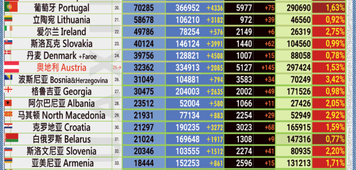 根据内政部的数据奥地利的新冠病毒死亡人数已首次上升至 5000 多人,在过去的24小时之内再次超过了一百多名死亡者。此外,这也意味着奥地利的新冠病毒病亡总人数已经超过了全中国疫情的病亡总人数 (到今天为止有 4 769 名病亡者: 数据包括台湾,香港与澳门)。