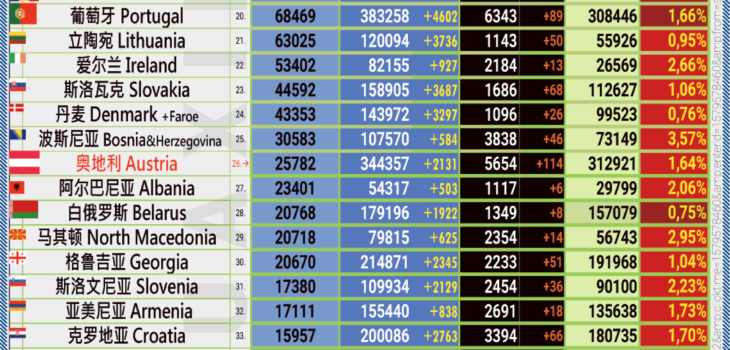 Uncategorised 23.12.2020: COVID-19 奥地利疫情报告。 23rd December 202023rd December 2020 by Huaxin Admin 趋势处于动荡状态 今日新增确诊人数超两千一百病例。内政 和 卫生部周三报道,在过去的24小时内,整个奥地利登记的新型冠状病毒感染数量为 2131。本周三的现存患者人数略有减少至两万五千八百病例以上。 目前在医院接受治疗的感染者减少至 2775 (-147)名,重症监护患者的人数减少至 472 (-15)。 24小时内具体有 2131 例新感染 (维也纳州:366, 施蒂里亚州:366, 上奥地利州:346, 下奥地利州:289, 萨尔茨堡州:210, 蒂罗尔州:200, 克恩顿州:165, 福拉尔贝格州:140, 布尔根兰州:49). 周三数据: 重新突破两千例新感染 圣诞节前一天,奥地利今天的新冠新病例数恢复到前一周的高水平。最多的新感染发生在维也纳州与施蒂里亚州。其次是上奥地利州。周三, 内政和卫生部在24小时内报告了 2131例新感染与一百多例亡病。周三公布的 2131 例新感染病例的价值也很高,因为过去7天的平均值较低,为每天 2002 例。 然而,住院病人的数量继续略有下降。 仍有2775人在医院,其中有472人在重症监护室。与前一天相比减少了 147名住院病人, 重症监护病房少了 15人。到目前为止,奥地利已有 344 357 例阳性检测结果。 自大流行开始以来,在奥地利已进行了 3 682 136 项测试。 在过去的24小时内,报告了 38 440 次PCR测试,其中 5.5%是阳性。 • 全球疫情表+各国7日发病率 • 奥地利新冠红绿灯地图 | 疫情走势图标 | 出入指南 | 疫情报告日历周50-51 请点击《华信报 欧洲版》内容请见 06,07 与 07at版面