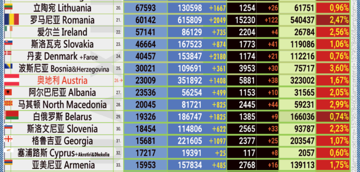 Uncategorised 27.12.2020: COVID-19 新型冠状欧洲疫情表。 27th December 202027th December 2020 by Huaxin Admin 40 SHARES 在脸书分享 • Share on Facebook 推特 • Tweet 电子邮件关注 • Follow us Please leave this field empty .: 在这里您可以订阅我们的电子邮件通知。当我们网站上发表新文章时,您将收到一封电子邮件。:. | | .: Here you can subscripe to our email notifications. When a new article is published on our website, you will receive an email. :. .: 订阅是免费的。 所有数据将按照DSGVO进行保存。:. | :: The subscription is free of charge. All data will be saved compliant to DSGVO. :: 电子邮件 | Email Address * We don’t spam! Read our [link]privacy policy[/link] for more info. You’ve been successfully subscribed to our newsletter! 27.12.2020: COVID-19 奥地利疫情报告。 28.12.2020: COVID-19 奥地利疫情报告。 Huaxin Admin 27.12.2020: COVID-19 新型冠状欧洲疫情表 Related articles 23.05.2023: COVID-19 新型冠状欧洲疫情表05.05.2023: COVID-19 新型冠状欧洲疫情表22.04.2023: COVID-19 新型冠状欧洲疫情表11.04.2023: COVID-19 新型冠状欧洲疫情表02.04.2023: COVID-19 新型冠状欧洲疫情表01.04.2023: COVID-19 新型冠状欧洲疫情表30.03.2023: COVID-19 新型冠状欧洲疫情表29.03.2023: COVID-19 新型冠状欧洲疫情表28.03.2023: COVID-19 新型冠状欧洲疫情表26.03.2023: COVID-19 新型冠状欧洲疫情表25.03.2023: COVID-19 新型冠状欧洲疫情表24.03.2023: COVID-19 新型冠状欧洲疫情表