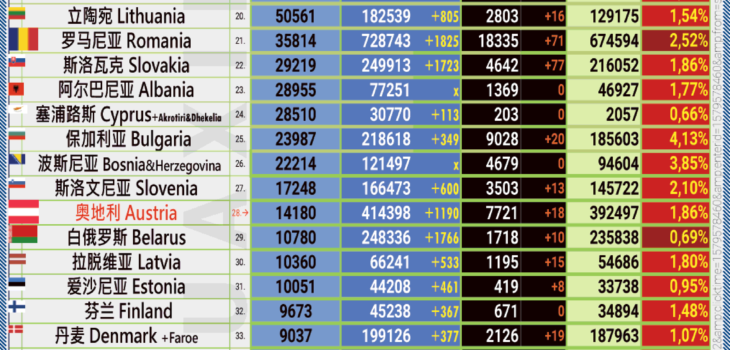 24小时内具体有 1641 例新感染 (下奥地利州:361, 施蒂里亚州:288, 维也纳州:264, 上奥地利州:186, 蒂罗尔州:157, 萨尔茨堡州:125, 克恩顿州:123, 布尔根兰州:73, 福拉尔贝格州:64).