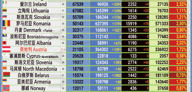 24小时内具体有 1391 例新感染 (下奥地利州:287,维也纳州:277, 上奥地利州:262, 蒂罗尔州:153, 萨尔茨堡州:150, 克恩顿州:96, 福拉尔贝格州:69,布尔根兰州:59, 施蒂里亚州:38).