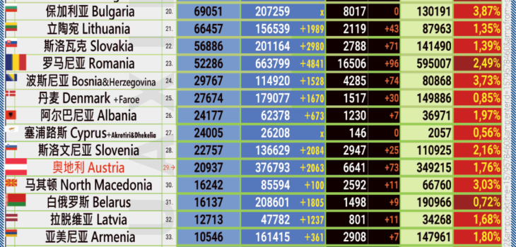 24小时内具体有 2063 例新感染 (维也纳州:380,下奥地利州:321, 施蒂里亚州:312, 萨尔茨堡州:282, 上奥地利州:253, 蒂罗尔州:201, 克恩顿州:158, 福拉尔贝格州:109,布尔根兰州:47).