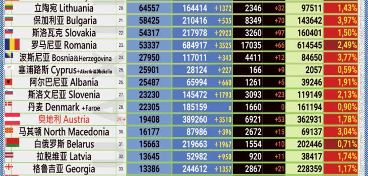 24小时内具体有 3510 例新感染 (克恩顿州:1073, 上奥地利州:1056, 维也纳州:404, 下奥地利州:266, 萨尔茨堡州:211, 施蒂里亚州:182,福拉尔贝格州:132, 蒂罗尔州:130,布尔根兰州:56).