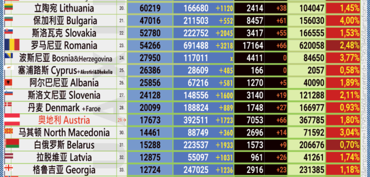 24小时内具体有 1723 例新感染 (维也纳州:371, 下奥地利州:298, 上奥地利州:265, 施蒂里亚州:228, 蒂罗尔州:162, 萨尔茨堡州:151, 克恩顿州:127, 福拉尔贝格州:78, 布尔根兰州:43).