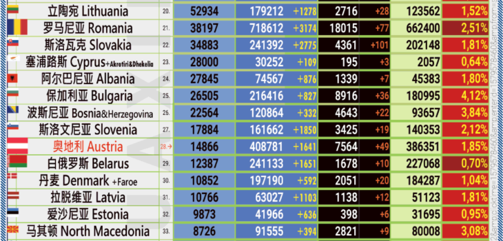 24小时内具体有 1641 例新感染 (下奥地利州:361, 施蒂里亚州:288, 维也纳州:264, 上奥地利州:186, 蒂罗尔州:157, 萨尔茨堡州:125, 克恩顿州:123, 布尔根兰州:73, 福拉尔贝格州:64).