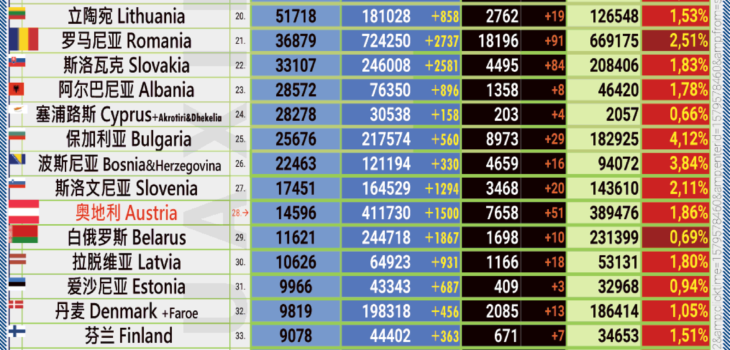 24小时内具体有 1500 例新感染 (维也纳州:315,上奥地利州:258, 施蒂里亚州:242, 下奥地利州:233, 克恩顿州:144, 萨尔茨堡州:131, 蒂罗尔州:95, 福拉尔贝格州:61, 布尔根兰州:21).