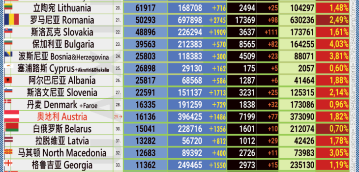 24小时内具体有 3510 例新感染 (克恩顿州:1073, 上奥地利州:1056, 维也纳州:404, 下奥地利州:266, 萨尔茨堡州:211, 施蒂里亚州:182,福拉尔贝格州:132, 蒂罗尔州:130,布尔根兰州:56).