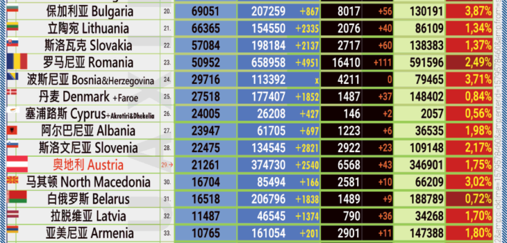 最多的新感染发生在上奥地利州。其次是下奥地利州与维也纳州。奥地利大流行的疫情仍然没有放松。 新感染的数量仍然很高,并且还在不断的增加。卫生和内政部报告从星期二到星期三,有 2 469人呈阳性。