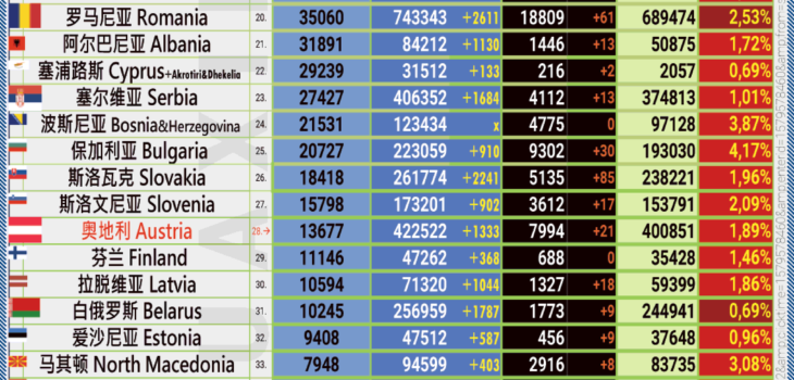 Uncategorised 06.02.2021: COVID-19 奥地利疫情报告。 6th February 20216th February 2021 by Huaxin Admin 数字相对稳定 今日新增确诊人数超过一千三百病例 。内政 和 卫生部周六报道,在过去的24小时内,整个奥地利登记的新型冠状病毒感染数量为 1333。本周六的现存患者人数略有减少至一万三千七百病例以下。 目前在医院接受治疗的感染者减少至 1592 (-22)名,重症监护患者的人数减少至 302 名(-4)。 24小时内具体有 1333 例新感染 (下奥地利州:273, 上奥地利州:246, 施蒂里亚州:208, 维也纳州:198, 克恩顿州:114, 蒂罗尔州:98, 萨尔茨堡州:94, 布尔根兰州:51, 福拉尔贝格州:51). 周六新增: 新感染超过一千三百例 最多的新感染发生在下奥地利州。其次是 上奥地利州与施蒂里亚州。卫生部和内政部周六报告说,有 1 333 人感染了COVID-19。 在硬封锁进行的第六周之后,这一数字仍处于较高水平。自大流行爆发以来,整个奥地利迄今已有422 522人被新冠病毒感染与已康复了400 851 人。 本周末疫苗接种的总数即将超越三十万剂 “本周末的疫苗接种总数将超过300 000剂,所有退休和疗养院 (除感染率高的个别病例外) 已完成第一个疫苗接种周期,并处于第二个接种周期的中期。Anschober 说,总共有 63 000 人已经进行了第二次接种,几天后就会有疫苗的保护。 • 全球疫情表+各国7日发病率 • 奥地利新冠红绿灯地图 | 疫情走势图标 | 出入指南 | 疫情报告日历周04-05 请点击《华信报 欧洲版》内容请见 06,07 与 07at版面