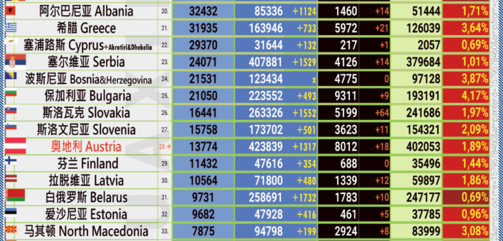 24小时内具体有 1317 例新感染 (维也纳州:372, 下奥地利州:308, 施蒂里亚州:151, 克恩顿州:115, 上奥地利州:110, 蒂罗尔州:88, 萨尔茨堡州:83, 福拉尔贝格州:56, 布尔根兰州:34).
