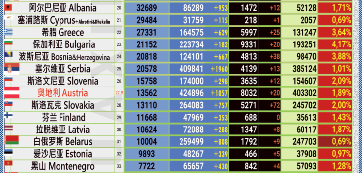 24小时内具体有 1057 例新感染 (下奥地利州:274, 维也纳州:187, 上奥地利州:166, 施蒂里亚州:132, 萨尔茨堡州:78, 蒂罗尔州:75, 克恩顿州:69, 布尔根兰州:43, 福拉尔贝格州:33).