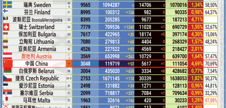 19.07.2021: COVID-19 新型冠状欧洲疫情表。