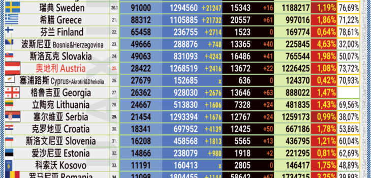 Uncategorised 28.12.2021: COVID-19 新型冠状欧洲疫情表。 28th December 2021 by Huaxin Admin 40 SHARES 在脸书分享 • Share on Facebook 推特 • Tweet 电子邮件关注 • Follow us Please leave this field empty .: 在这里您可以订阅我们的电子邮件通知。当我们网站上发表新文章时,您将收到一封电子邮件。:. | | .: Here you can subscripe to our email notifications. When a new article is published on our website, you will receive an email. :. .: 订阅是免费的。 所有数据将按照DSGVO进行保存。:. | :: The subscription is free of charge. All data will be saved compliant to DSGVO. :: 电子邮件 | Email Address * We don’t spam! Read our [link]privacy policy[/link] for more info. You’ve been successfully subscribed to our newsletter! 27.12.2021: COVID-19 新型冠状欧洲疫情表。 29.12.2021: COVID-19 新型冠状欧洲疫情表。 Huaxin Admin Related articles 23.05.2023: COVID-19 新型冠状欧洲疫情表05.05.2023: COVID-19 新型冠状欧洲疫情表22.04.2023: COVID-19 新型冠状欧洲疫情表11.04.2023: COVID-19 新型冠状欧洲疫情表02.04.2023: COVID-19 新型冠状欧洲疫情表01.04.2023: COVID-19 新型冠状欧洲疫情表30.03.2023: COVID-19 新型冠状欧洲疫情表29.03.2023: COVID-19 新型冠状欧洲疫情表28.03.2023: COVID-19 新型冠状欧洲疫情表26.03.2023: COVID-19 新型冠状欧洲疫情表25.03.2023: COVID-19 新型冠状欧洲疫情表24.03.2023: COVID-19 新型冠状欧洲疫情表