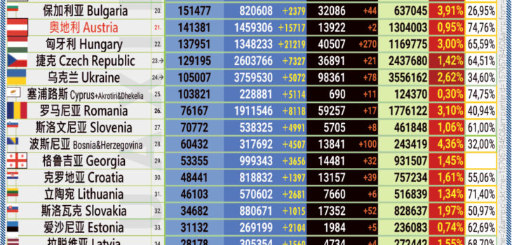 17.01.2022: COVID-19 新型冠状欧洲疫情表。