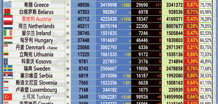 Uncategorised 22.05.2022: COVID-19 新型冠状欧洲疫情表。 23rd May 202223rd May 2022 by Huaxin Admin 40 SHARES 在脸书分享 • Share on Facebook 推特 • Tweet 电子邮件关注 • Follow us Please leave this field empty .: 在这里您可以订阅我们的电子邮件通知。当我们网站上发表新文章时,您将收到一封电子邮件。:. | | .: Here you can subscripe to our email notifications. When a new article is published on our website, you will receive an email. :. .: 订阅是免费的。 所有数据将按照DSGVO进行保存。:. | :: The subscription is free of charge. All data will be saved compliant to DSGVO. :: 电子邮件 | Email Address * We don’t spam! Read our [link]privacy policy[/link] for more info. You’ve been successfully subscribed to our newsletter! 《 欧洲华信报 》 总第 1168 期欧洲版 23.05.2022: COVID-19 新型冠状欧洲疫情表。 Huaxin Admin 22.05.2022: COVID-19 新型冠状欧洲疫情表 Related articles 23.05.2023: COVID-19 新型冠状欧洲疫情表05.05.2023: COVID-19 新型冠状欧洲疫情表22.04.2023: COVID-19 新型冠状欧洲疫情表11.04.2023: COVID-19 新型冠状欧洲疫情表02.04.2023: COVID-19 新型冠状欧洲疫情表01.04.2023: COVID-19 新型冠状欧洲疫情表30.03.2023: COVID-19 新型冠状欧洲疫情表29.03.2023: COVID-19 新型冠状欧洲疫情表28.03.2023: COVID-19 新型冠状欧洲疫情表26.03.2023: COVID-19 新型冠状欧洲疫情表25.03.2023: COVID-19 新型冠状欧洲疫情表24.03.2023: COVID-19 新型冠状欧洲疫情表
