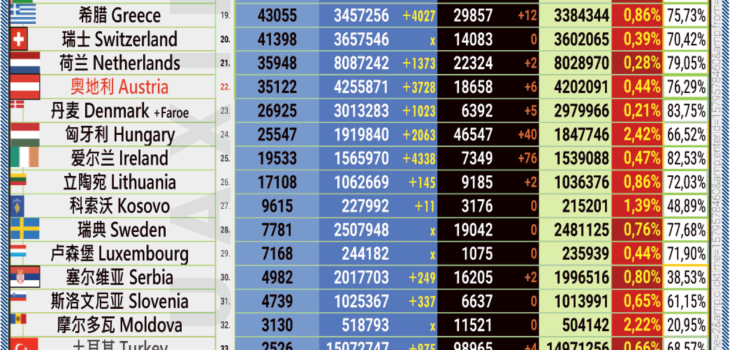 01.06.2022: COVID-19 新型冠状欧洲疫情表。
