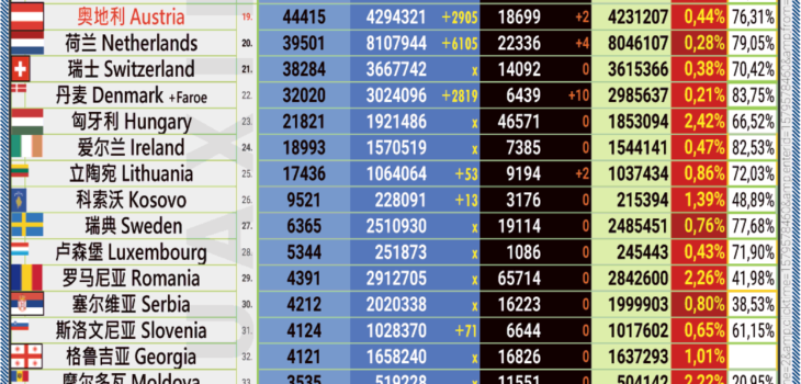 13.06.2022: COVID-19 新型冠状欧洲疫情表。