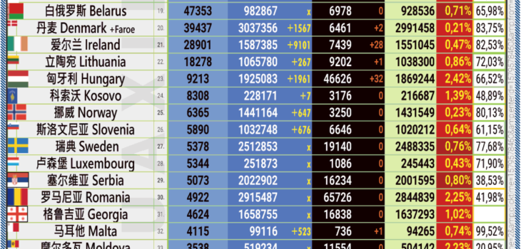 22.06.2022: COVID-19 新型冠状欧洲疫情表。