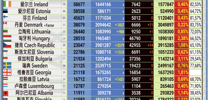 Uncategorised 29.07.2022: COVID-19 新型冠状欧洲疫情表。 29th July 202229th July 2022 by Huaxin Admin 7 40 SHARES 在脸书分享 • Share on Facebook 推特 • Tweet 电子邮件关注 • Follow us Please leave this field empty .: 在这里您可以订阅我们的电子邮件通知。当我们网站上发表新文章时,您将收到一封电子邮件。:. | | .: Here you can subscripe to our email notifications. When a new article is published on our website, you will receive an email. :. .: 订阅是免费的。 所有数据将按照DSGVO进行保存。:. | :: The subscription is free of charge. All data will be saved compliant to DSGVO. :: 电子邮件 | Email Address * We don’t spam! Read our [link]privacy policy[/link] for more info. You’ve been successfully subscribed to our newsletter! 28.07.2022: COVID-19 新型冠状欧洲疫情表。 30.07.2022: COVID-19 新型冠状欧洲疫情表。 Huaxin Admin 29.07.2022: COVID-19 新型冠状欧洲疫情表 Covid-19 Situation in Whole Europe including China, USA Related articles 23.05.2023: COVID-19 新型冠状欧洲疫情表05.05.2023: COVID-19 新型冠状欧洲疫情表22.04.2023: COVID-19 新型冠状欧洲疫情表11.04.2023: COVID-19 新型冠状欧洲疫情表02.04.2023: COVID-19 新型冠状欧洲疫情表01.04.2023: COVID-19 新型冠状欧洲疫情表30.03.2023: COVID-19 新型冠状欧洲疫情表29.03.2023: COVID-19 新型冠状欧洲疫情表28.03.2023: COVID-19 新型冠状欧洲疫情表26.03.2023: COVID-19 新型冠状欧洲疫情表25.03.2023: COVID-19 新型冠状欧洲疫情表24.03.2023: COVID-19 新型冠状欧洲疫情表