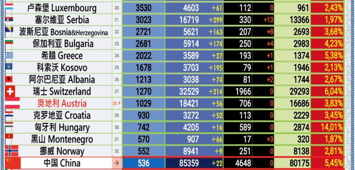 07.07.2020: COVID-19 新型冠状欧洲疫情表。