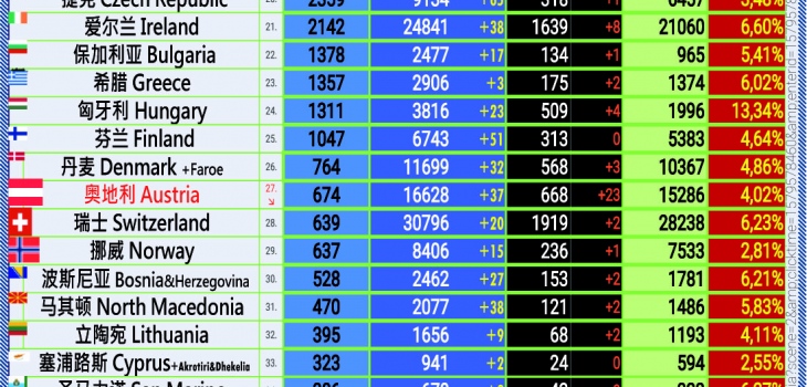 Uncategorised 28.05.2020: COVID-19 新型冠状欧洲疫情表。 28th May 202028th May 2020 by Huaxin Admin 俄罗斯继续暴增, 新增确诊人数八千多例。 英国还在大量的传播, 今日死亡人数近四百(全欧洲最高数)。 此外疫情在瑞典,白俄罗斯与土耳继续蔓延。 德国现存患者人数重新开始上升。奥地利,意大利与瑞士现存患者人数继续下降。 美国与巴西继续狂增